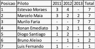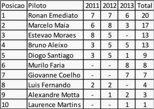 _ Por falar no campeão de 2013, Murilo já aparece na 5ª posição da tabela geral de pontuação, tendo disputado apenas uma temporada. Está seriamente ameaçado de ser agredido para não correr nunca mais e não subir ainda mais nas estatísticas.