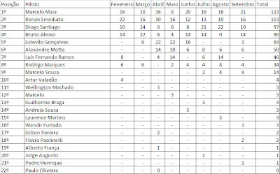 E, por fim, o grande destaque da prova, aliás do campeonato, aliás do universo. Finalmente Alexandre, depois de muita luta e demonstração de perícia durante todo o ano, conseguiu superar Luis Fernando no campeonato. Uma meta estabelecida por ele e cumprida, faltando três provas para o final da disputa. Um feito histórico. Parabéns Alexandre!