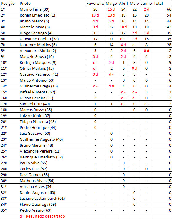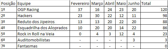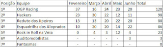 Para acompanhar a classificação, clique aqui (http://pentagrama.homeip.net:9001/~diogo.santiago/kartmobile/) ou veja as tabelas abaixo