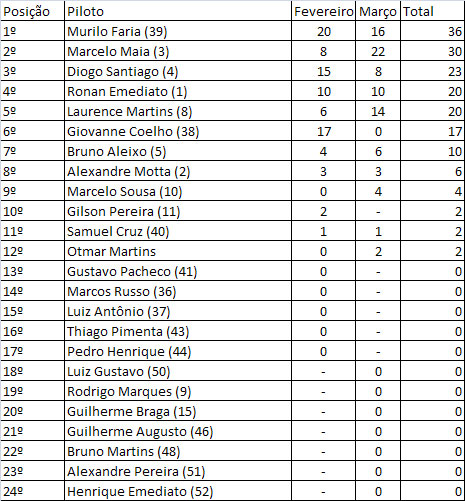 Discreto, Ronan terminou em quarto, mostrando uma regularidade que será importante no final do ano. Diogo foi o grande mistério da prova: classificou-se em segundo mas ficou praticamente parado na largada, sendo obrigado a fazer uma prova de recuperação. Acabou em quinto.